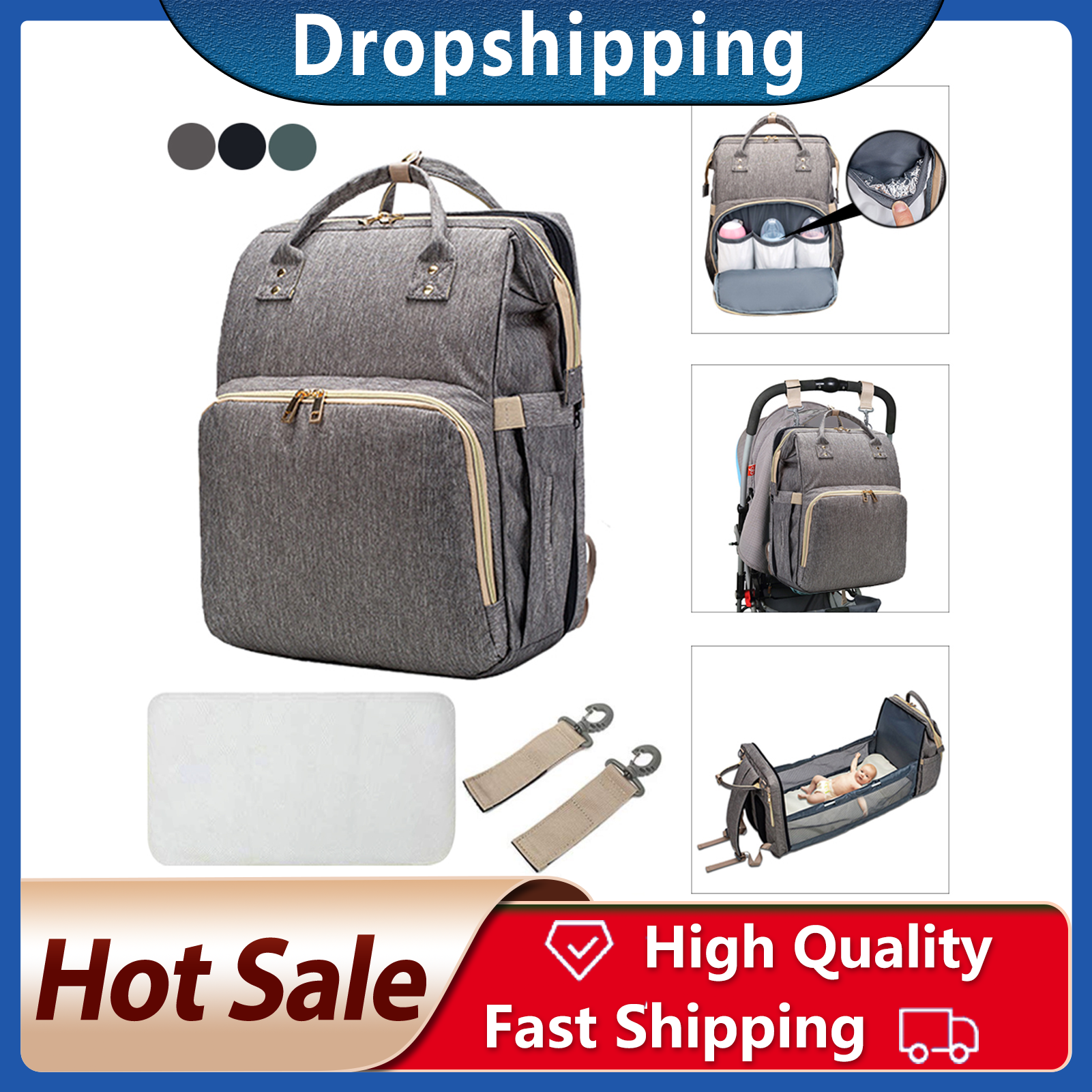 Specifications:Name: Multifunctional Baby Diaper BagAccessories: portable mattressMaterial: cationic fabric, PVC waterproof layer, pure cotton inner lining, aluminum foil thermal insulation cotton