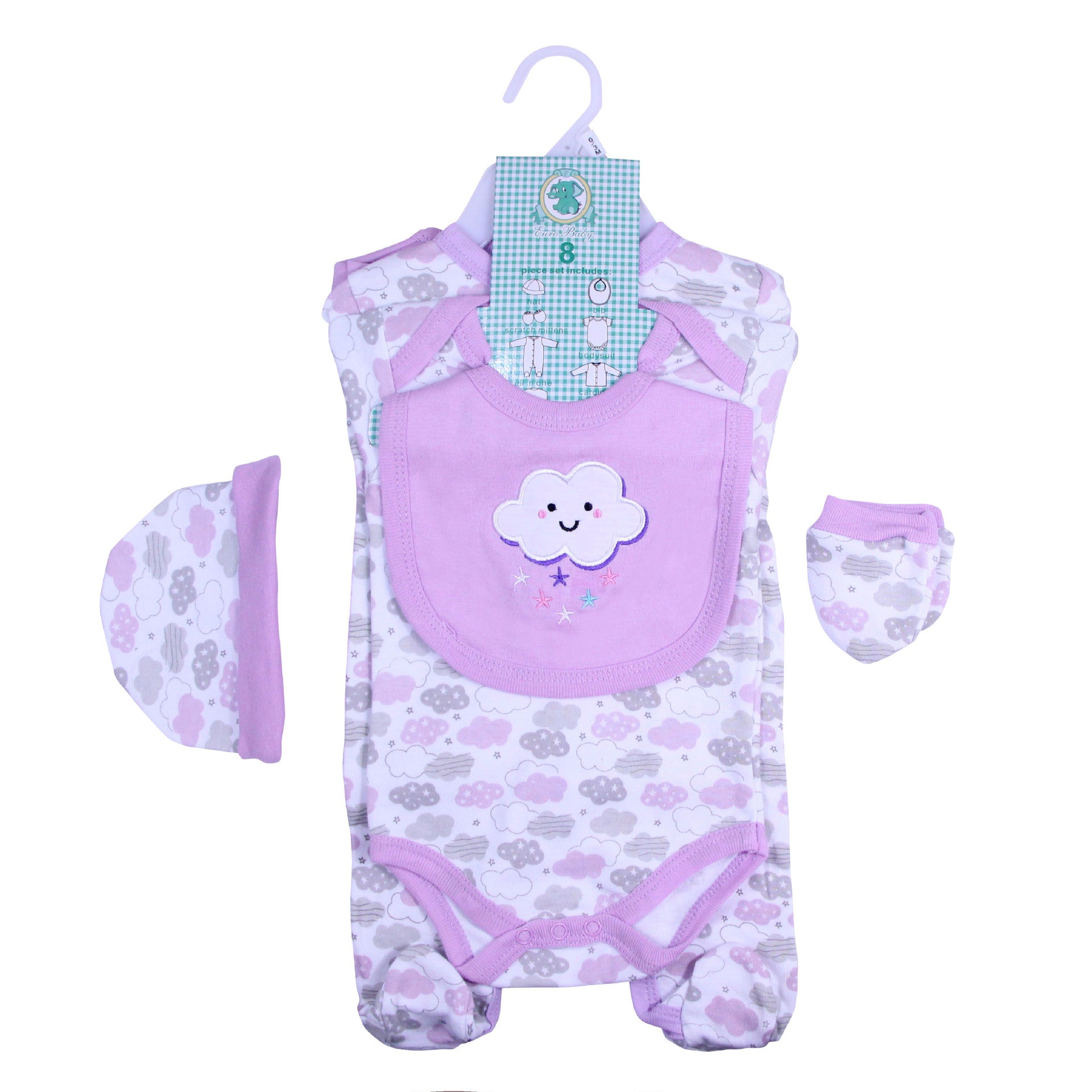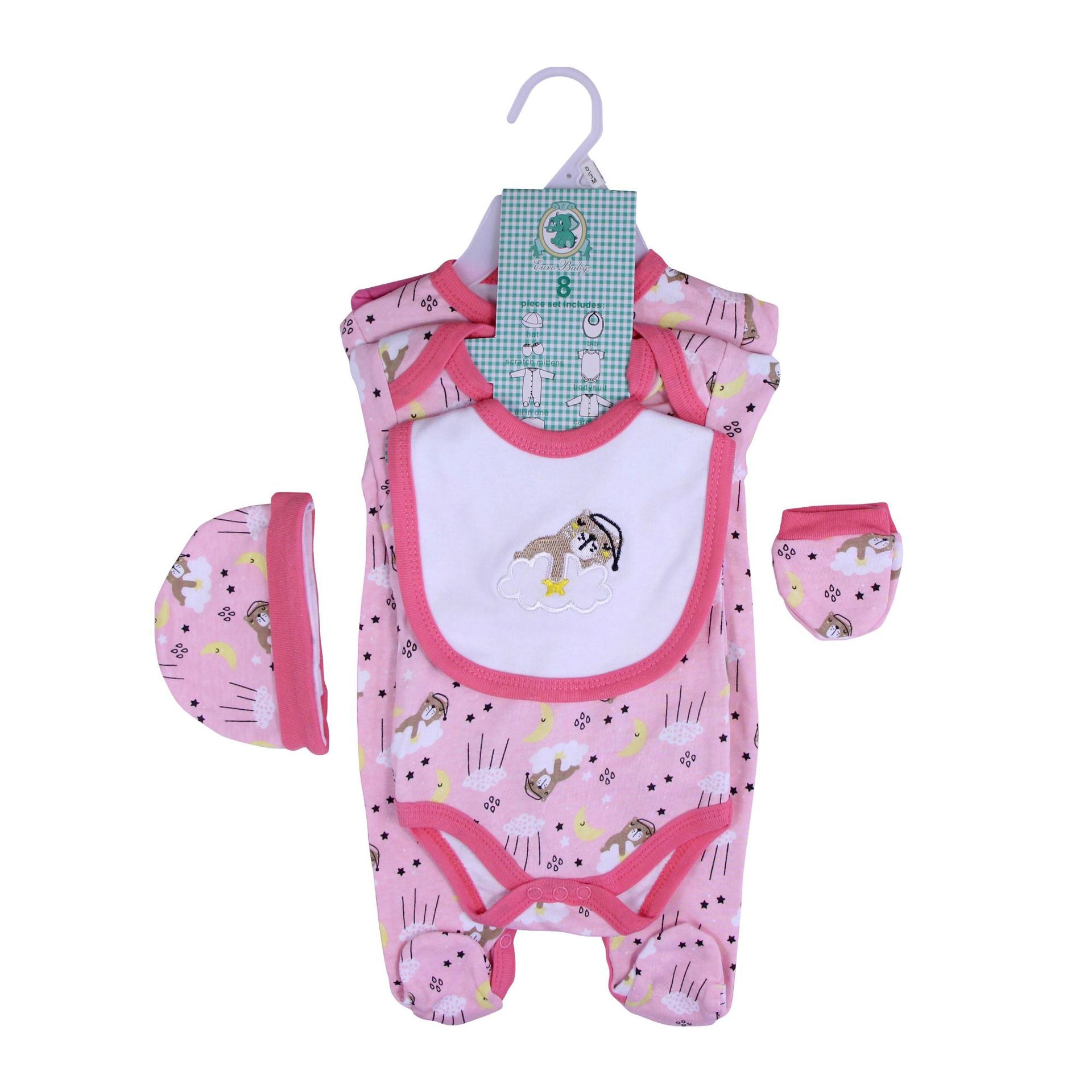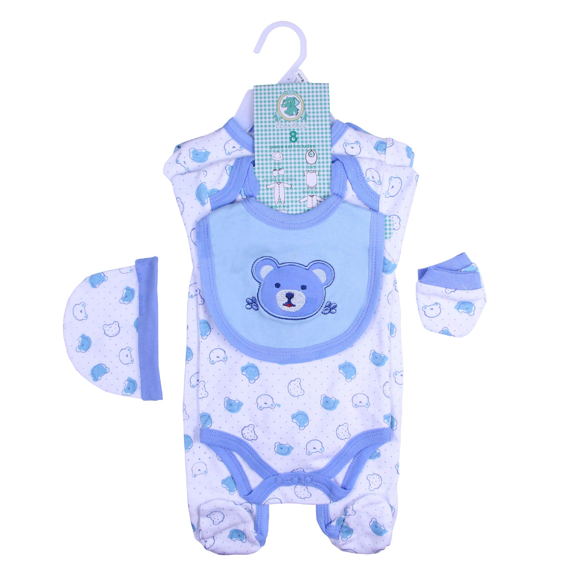Long-sleeved crawler +short-sleeved harness + long-sleeved cardigan + leggings+ gloves+ bib+Hat * 6sets( 3 sets for each size )
