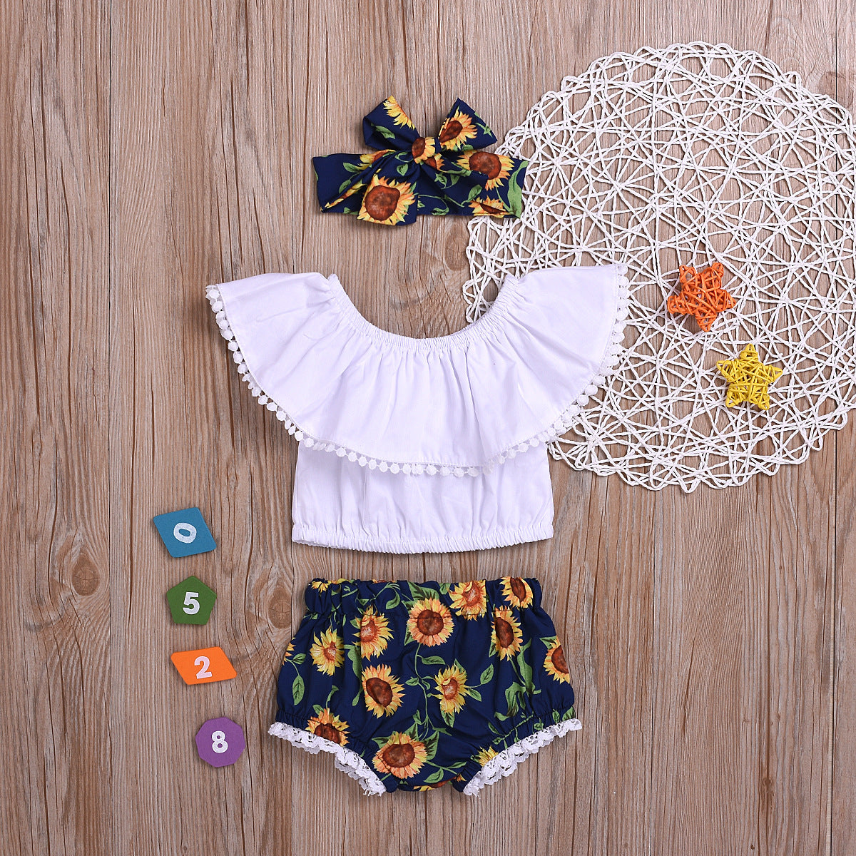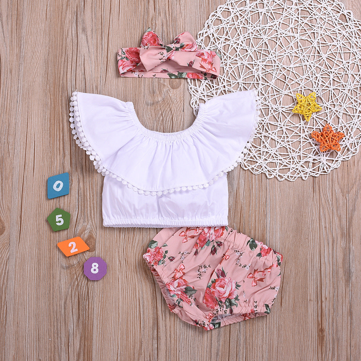 Two-color Baby Ruffled Collar Flower Shorts Headscarf Three-piece Set
